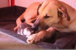 Ich habe ein paar Fotos von Bunny beigefügt. Bunny hat am ersten Tag einmal in die Wohnung gepinkelt, was wohl die Aufregung war, denn er ist seitdem stubenrein. Bunny ist einfach der beste Hund, den es gibt. Man kann alles mit ihm machen. Er ist lieb zu Kindern und Katzen, man kann ihn überall mit hinnehmen, er kann ein paar Stunden alleine bleiben und geht liebend gern zusammen mit mir und meinem Pferd ausreiten. Im Moment arbeiten wir daran, dass wir irgendwann die Begleithundeprüfung schaffen. Das wird aber noch n bisschen Arbeit sein, wenn Bunny nämlich keine Lust mehr hat, legt er sich einfach auf den Platz und stellt sich schlafend. Er verliert das ganze Jahr über außerdem schrecklich viele Haare und hat schlechte Zähne. Vor allem der beim Hertransport abgebrochene Fangzahn macht öfter Probleme. Dieser wurde schon operiert und hat eine Füllung erhalten, die aber leider wieder erneuert werden muss. Naja, irgendeine Macke muss er ja auch haben 🙂 Und viele haben eben auch Angst vor seiner Größe, was aber völlig unbegründet ist. Also alles in allem nochmal danke für diesen tollen Hund!
